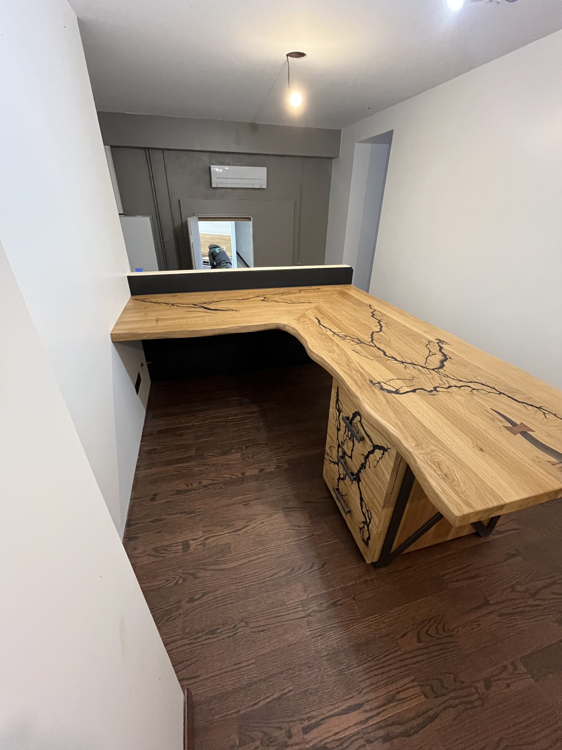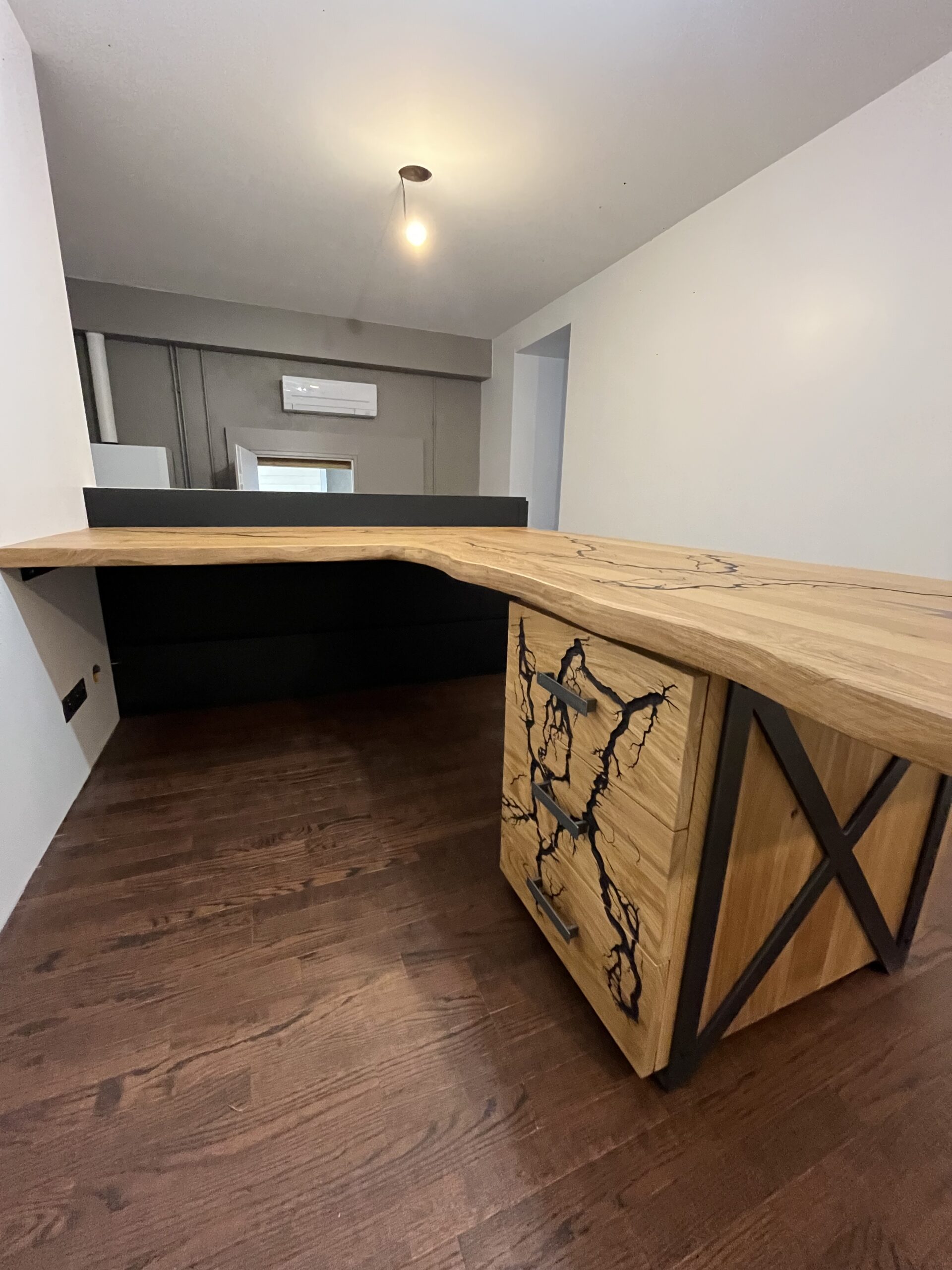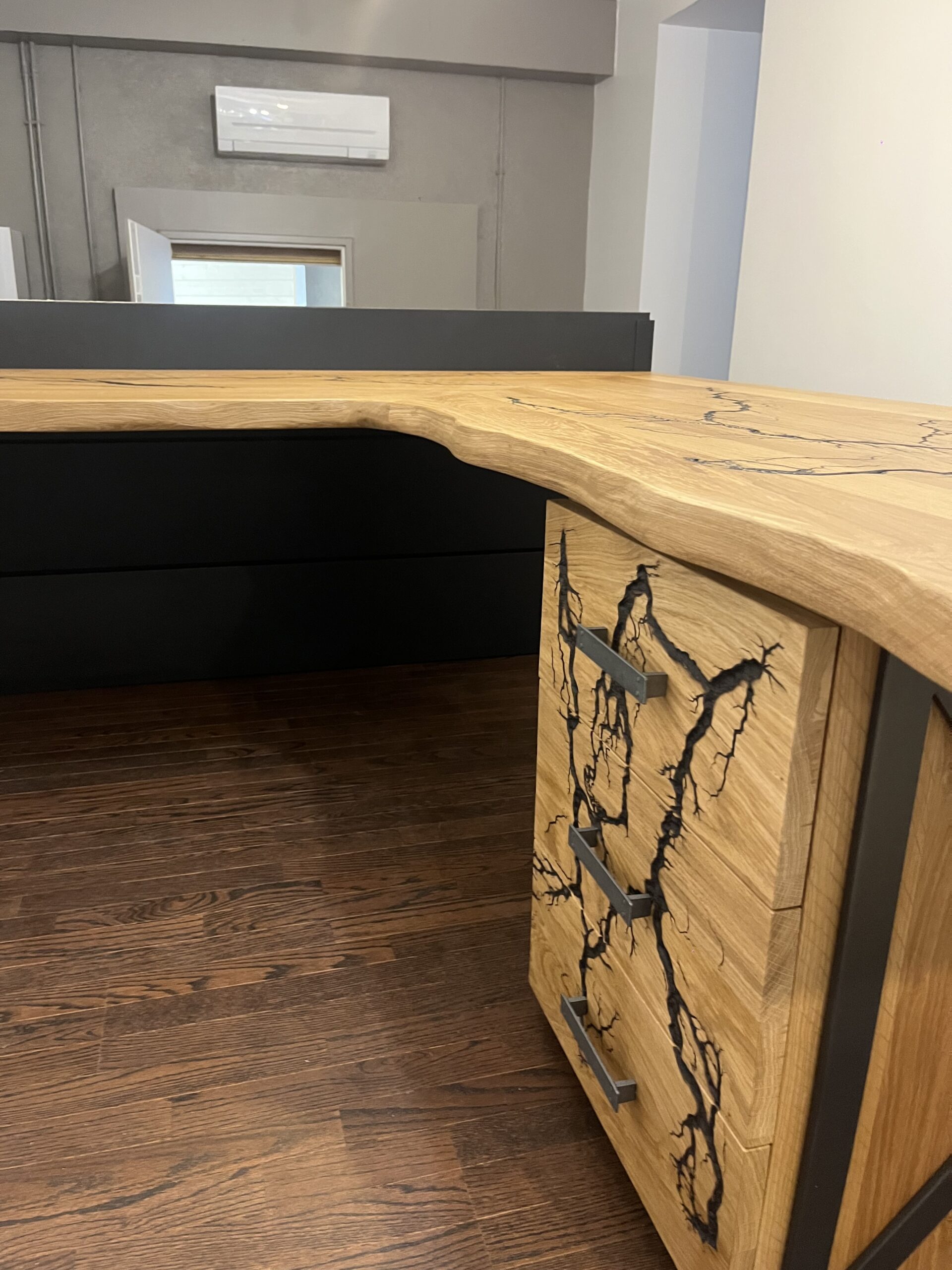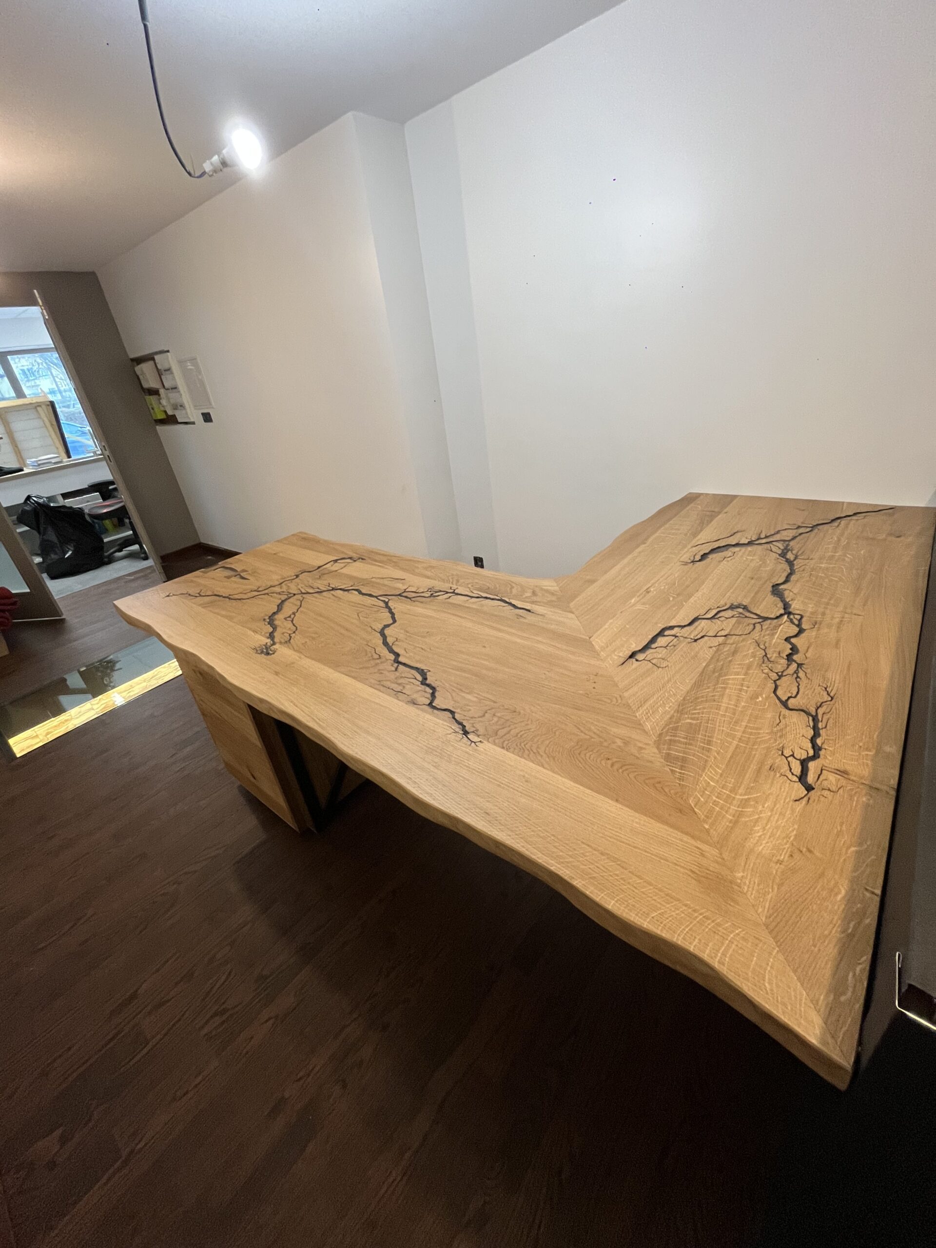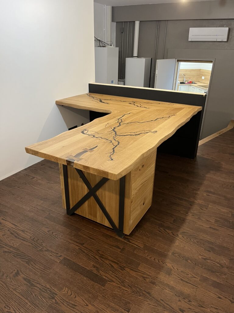 Bureau d’angle en chêne massif – Brûlure électrique & métal