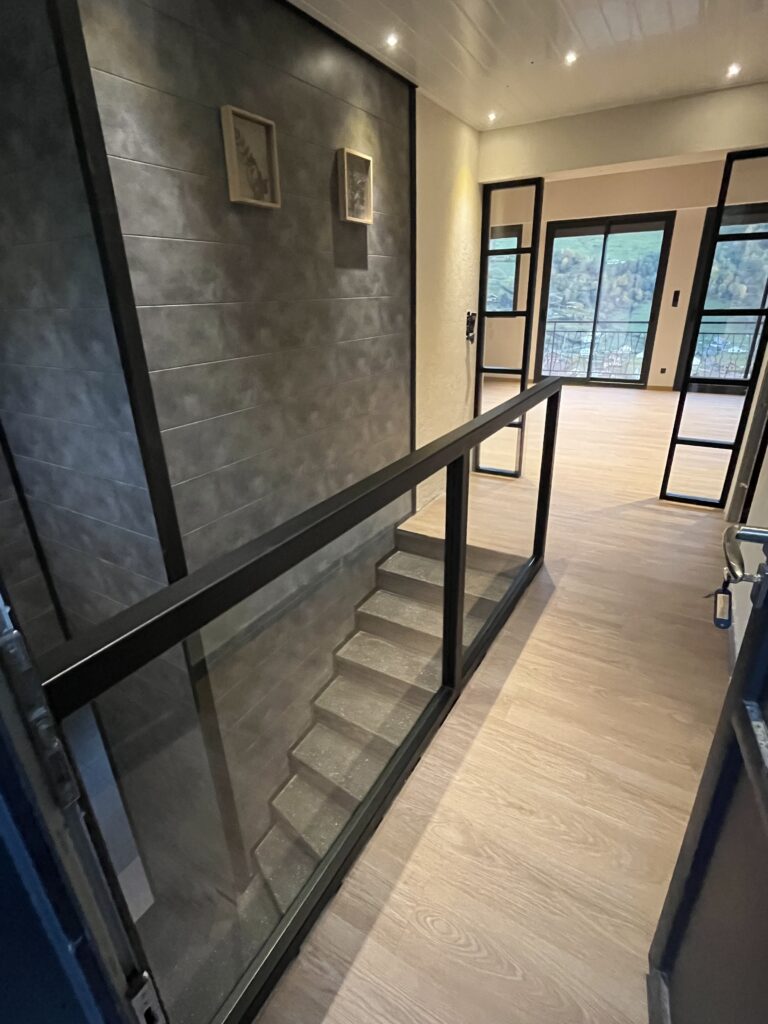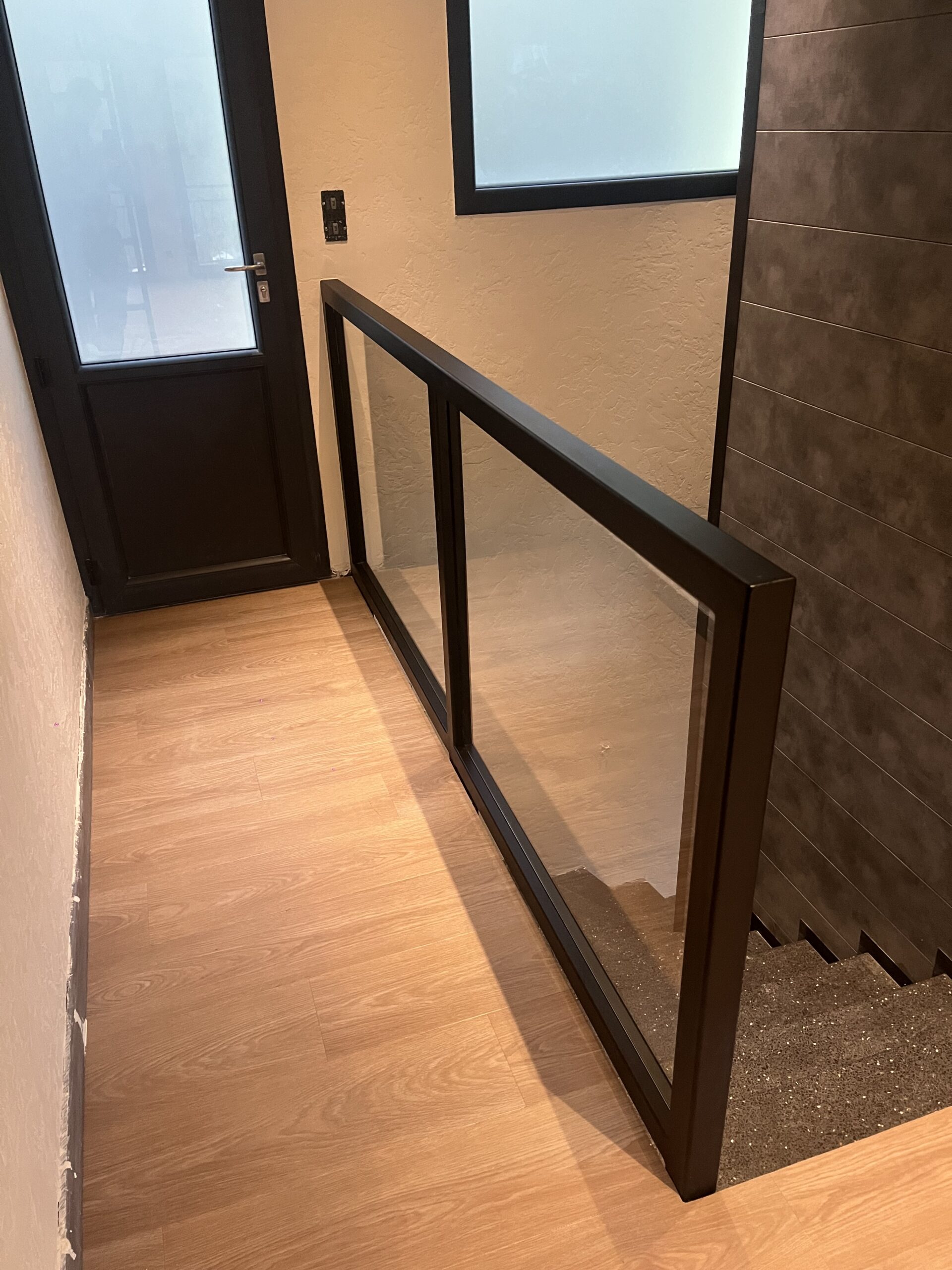 Ce garde-corps intérieur en acier thermolaqué noir allie sécurité et élégance. Son design épuré est sublimé par des vitrages intégrés qui laissent circuler la lumière tout en structurant l’espace.