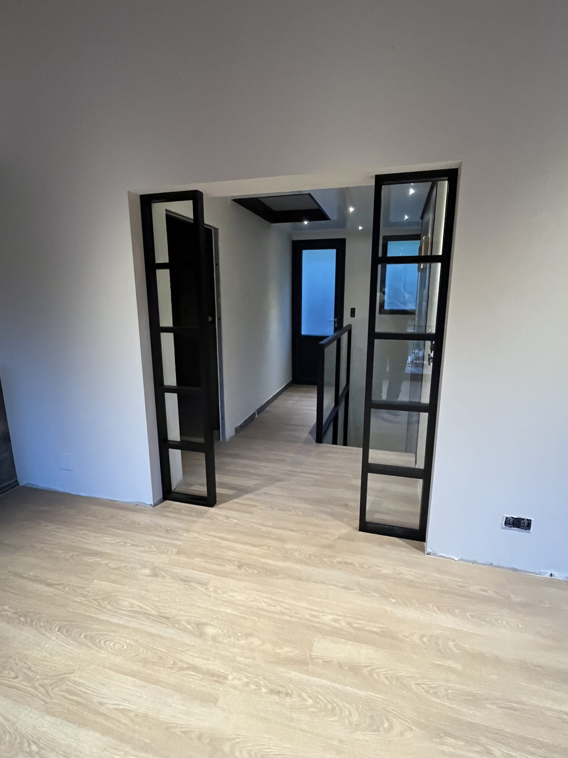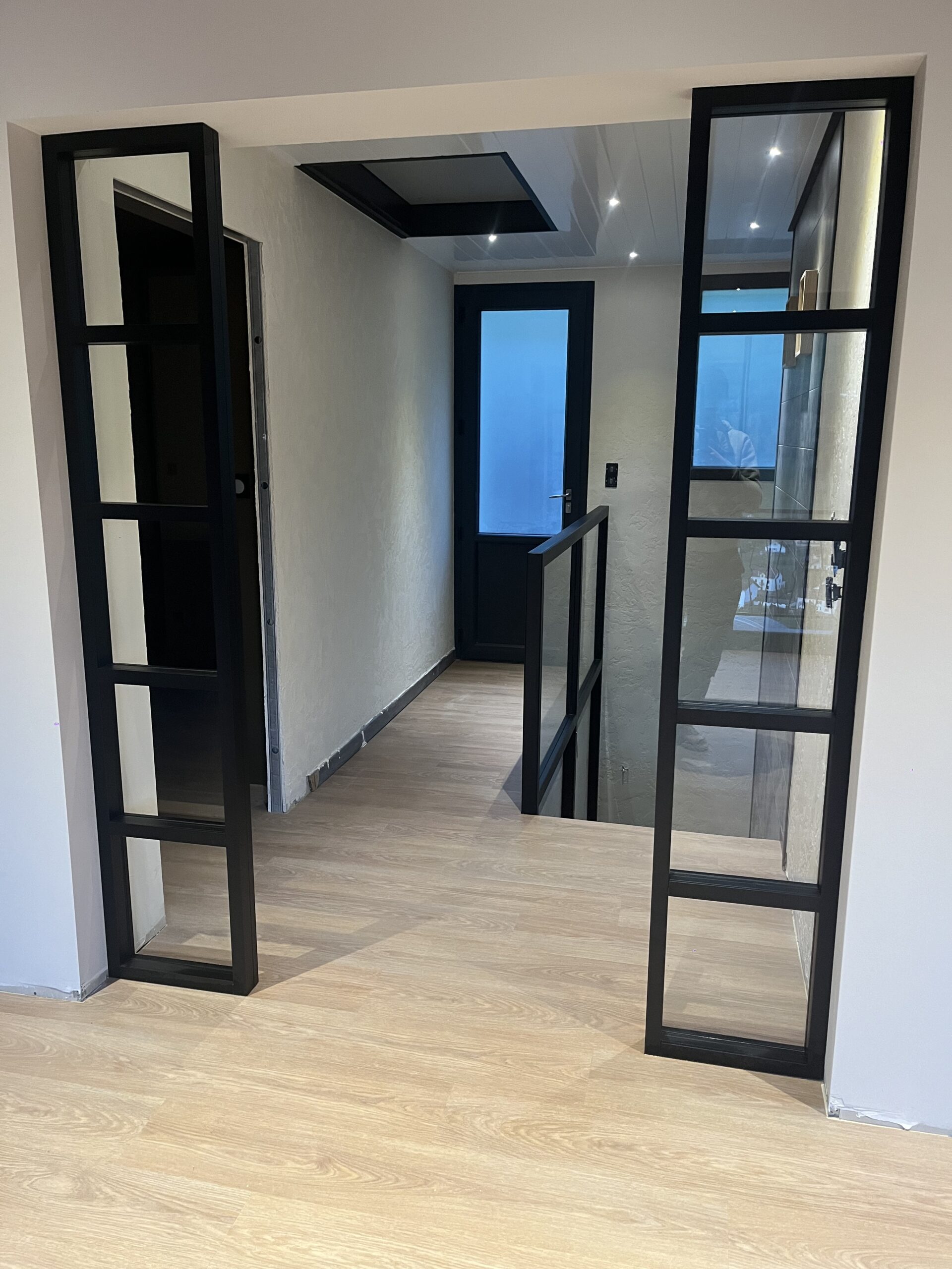 Il est complété par trois petites verrières de séparation, apportant une touche contemporaine et industrielle à l’intérieur. Elles délimitent les pièces avec légèreté, sans alourdir l’ambiance.